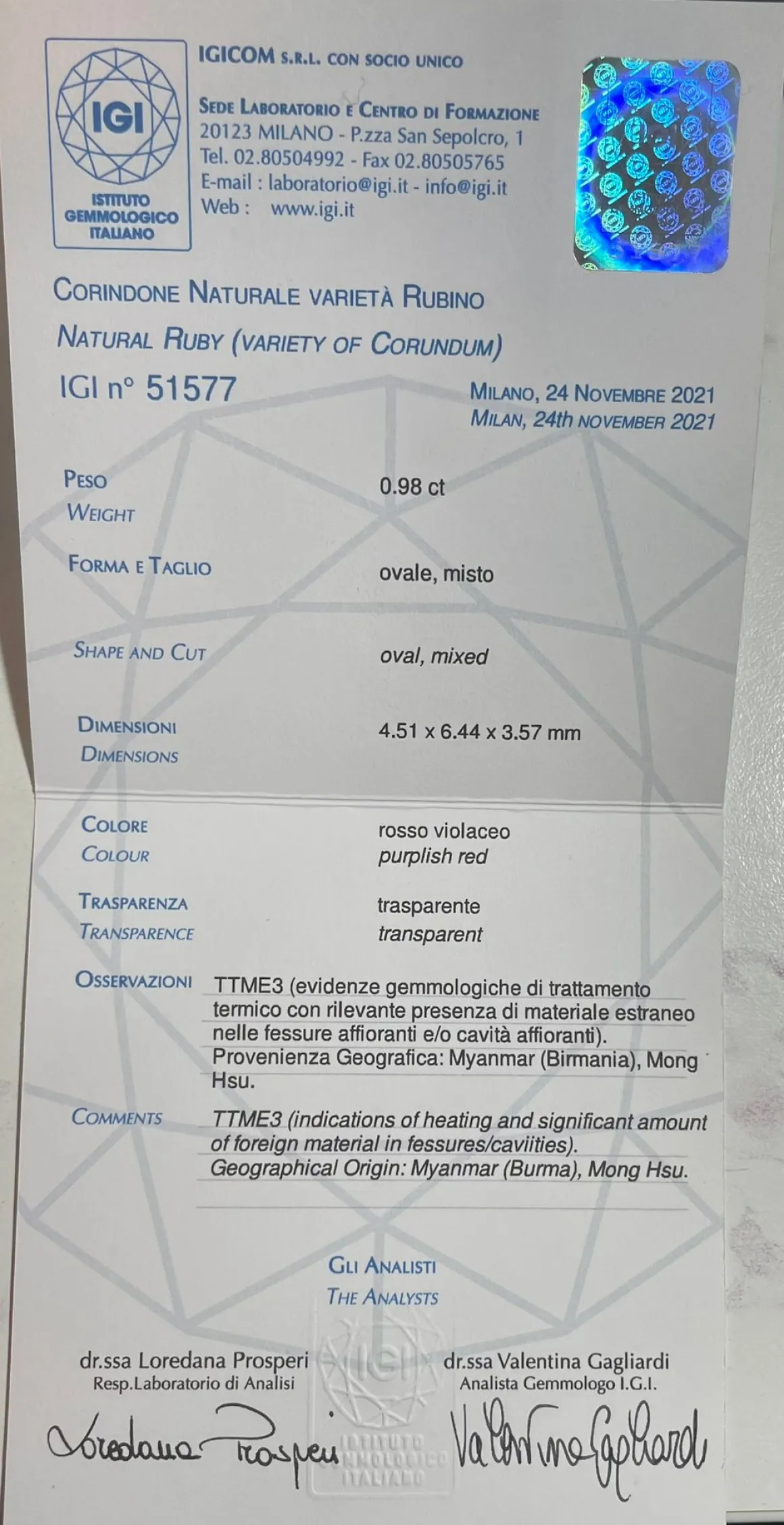 - Rubino naturale forma ovale ct 0.98 certificato IGI Milano