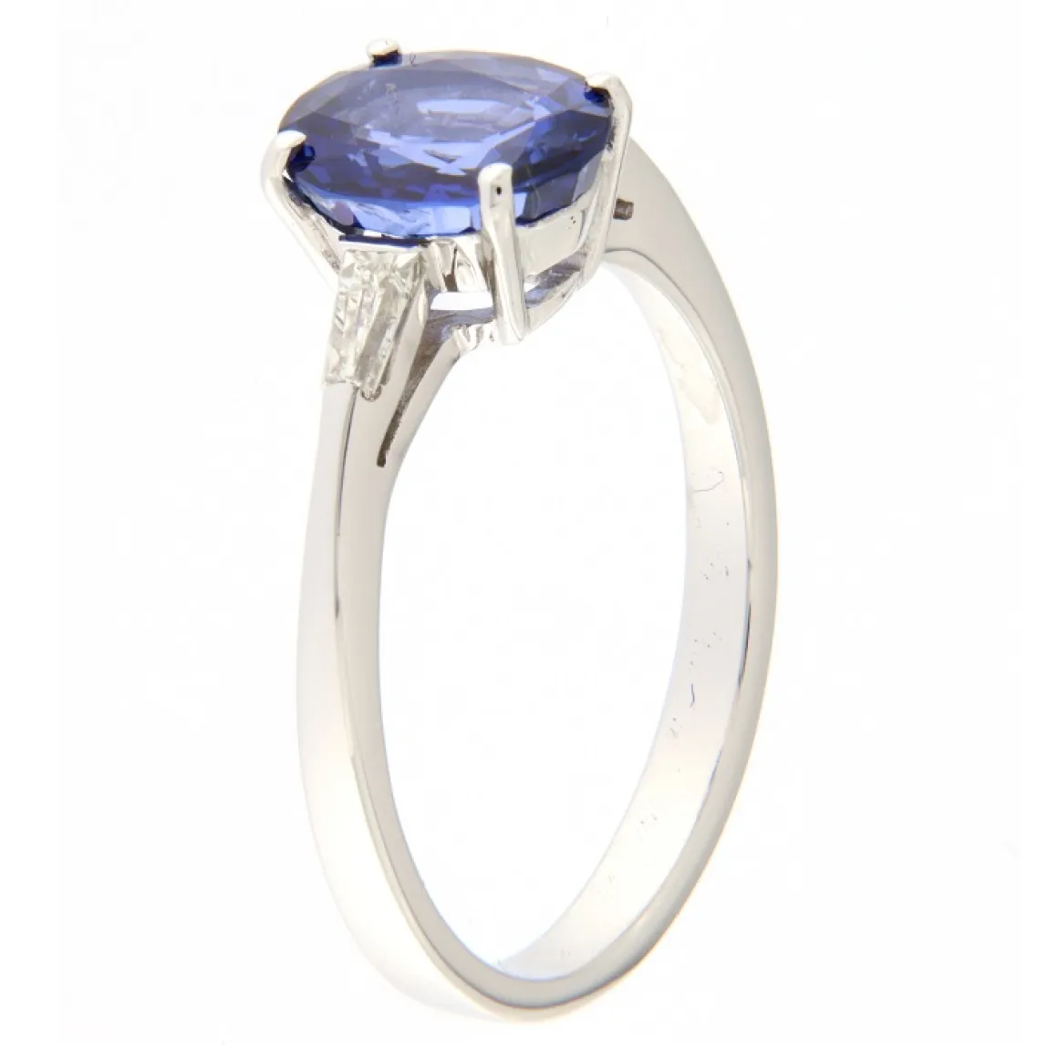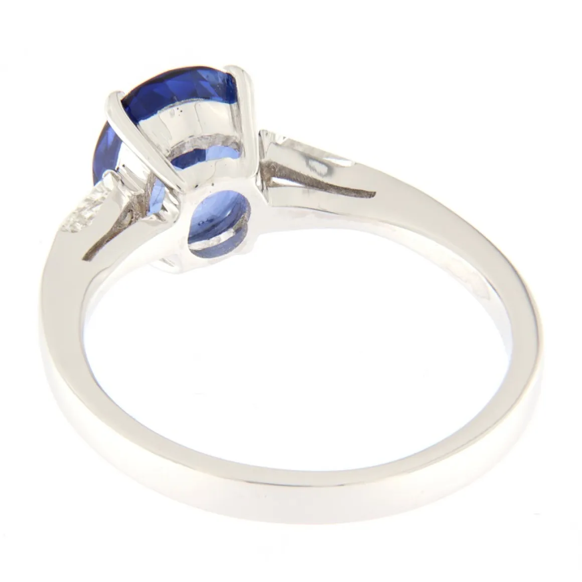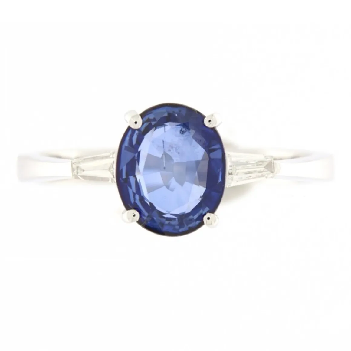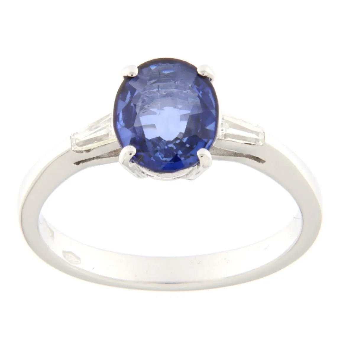 Guidetti | Anello in oro bianco con zaffiro e diamanti taglio baguette