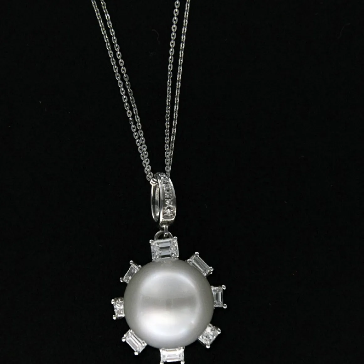 - Materiale: oro bianco 750/1000, perla coltivata d’acqua salata australiana, diamanti taglio baguette e brillanti