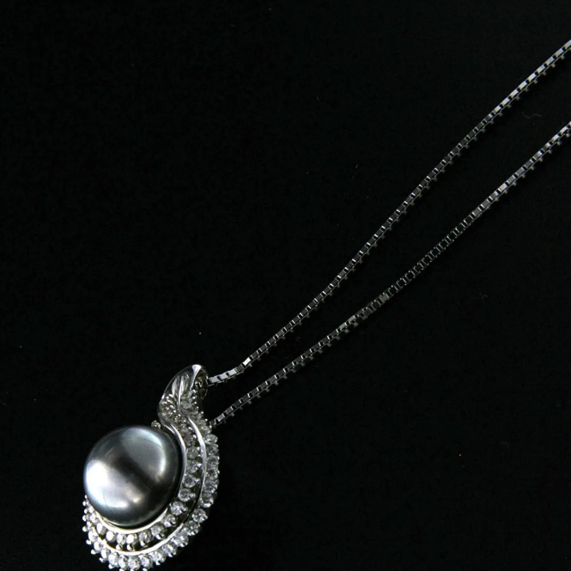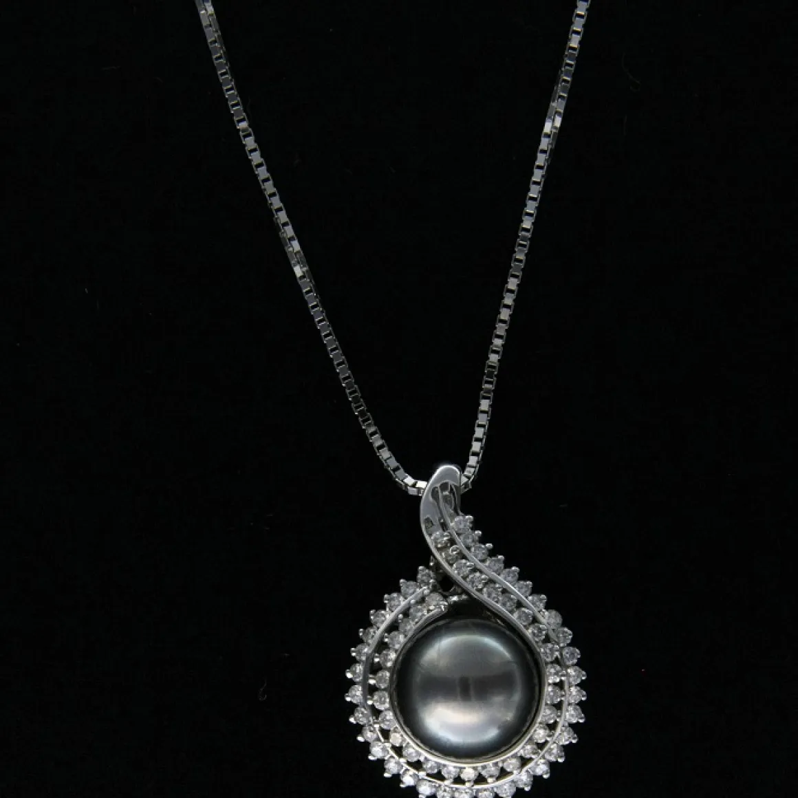 - Materiale: oro bianco 750/1000, perla coltivata d’acqua salata Nera di Tahiti, diamanti taglio brillante
