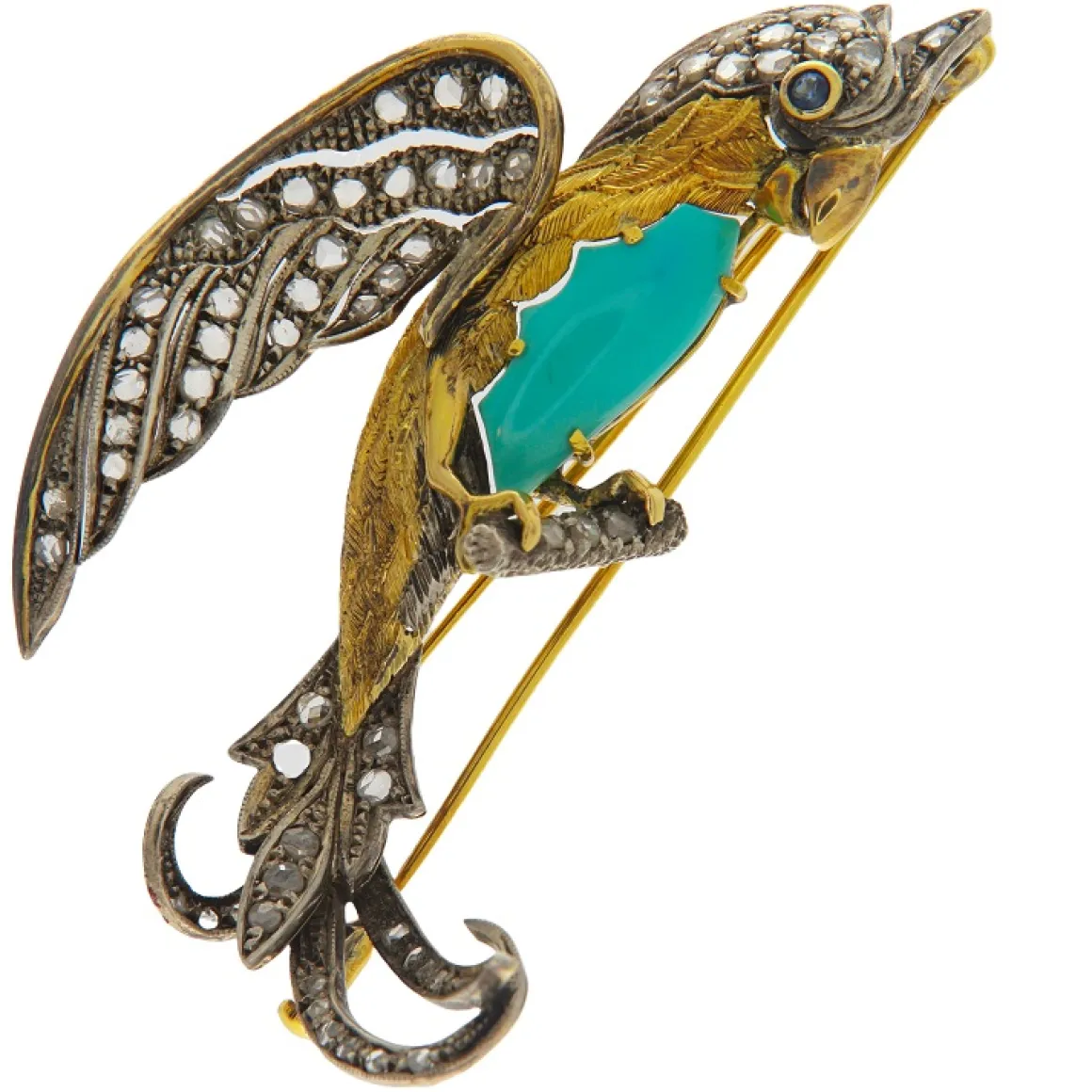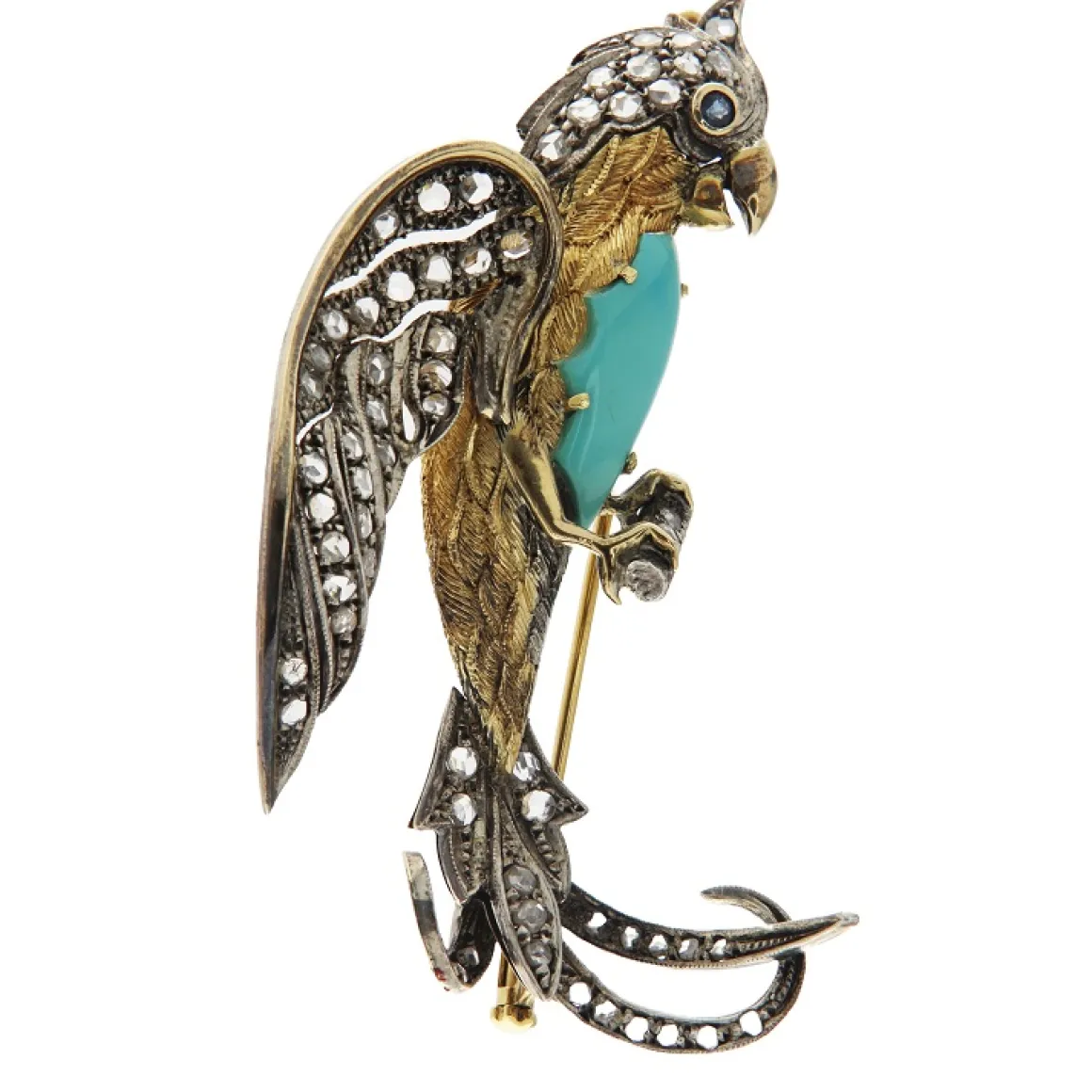 Guidetti | Spilla Pappagallo stile antico in oro, argento e diamanti