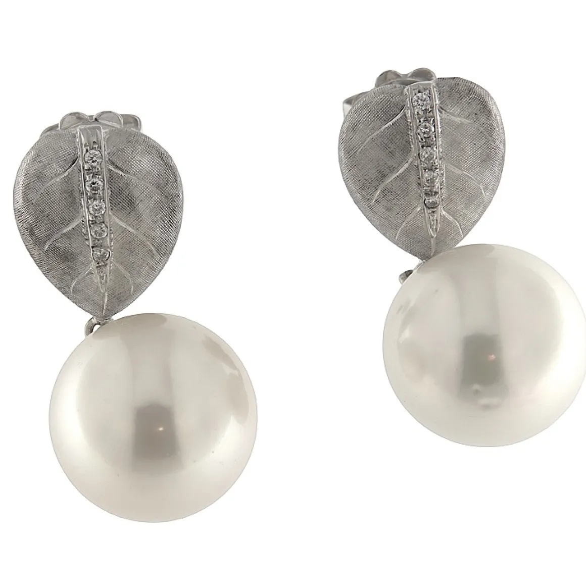 Orecchini pendenti in oro bianco con diamanti e perle diametro mm 14